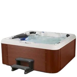 Settle into the Essential Hot Tubs Edgewater EX spa and experience hydrotherapeutic luxury at home. The Edgewater EX spa gives you acrylic spa luxury wrapped in a beautiful faux-wood, low-maintenance, exterior. All 40 fully-adjustable stainless-steel jets are powered by a 5 Peak HP, 2-speed energy-efficient pump. Have a relaxing evening or choose a more invigorating setting and massage away the day’s aches & pains with Edgewater EX’s high-speed hydrotherapy. Essential Hot Tub’s user-friendly, state-of-the-art command center with digital, backlit display allows customization of temperature, jets, lighting, and filtration. Experience the advantages of a larger pump and 4kW heater in the invigorating massage and performance you’ll receive during colder months. We recommend having this 240V spa professionally installed by a licensed electrician. Multicolor, programmable LED water columns, spa controls and underwater lighting adds ambience to your luxury spa experience. Perimeter insulation allows your spa to retain optimum heat from your Balboa all-season, stainless-steel heater all year long. Edgewater also comes with a heavy-duty, insulated tapered cover with locking clips allowing you to easily & comfortably close your spa while not in use. This product is delivered using a curbside delivery service.