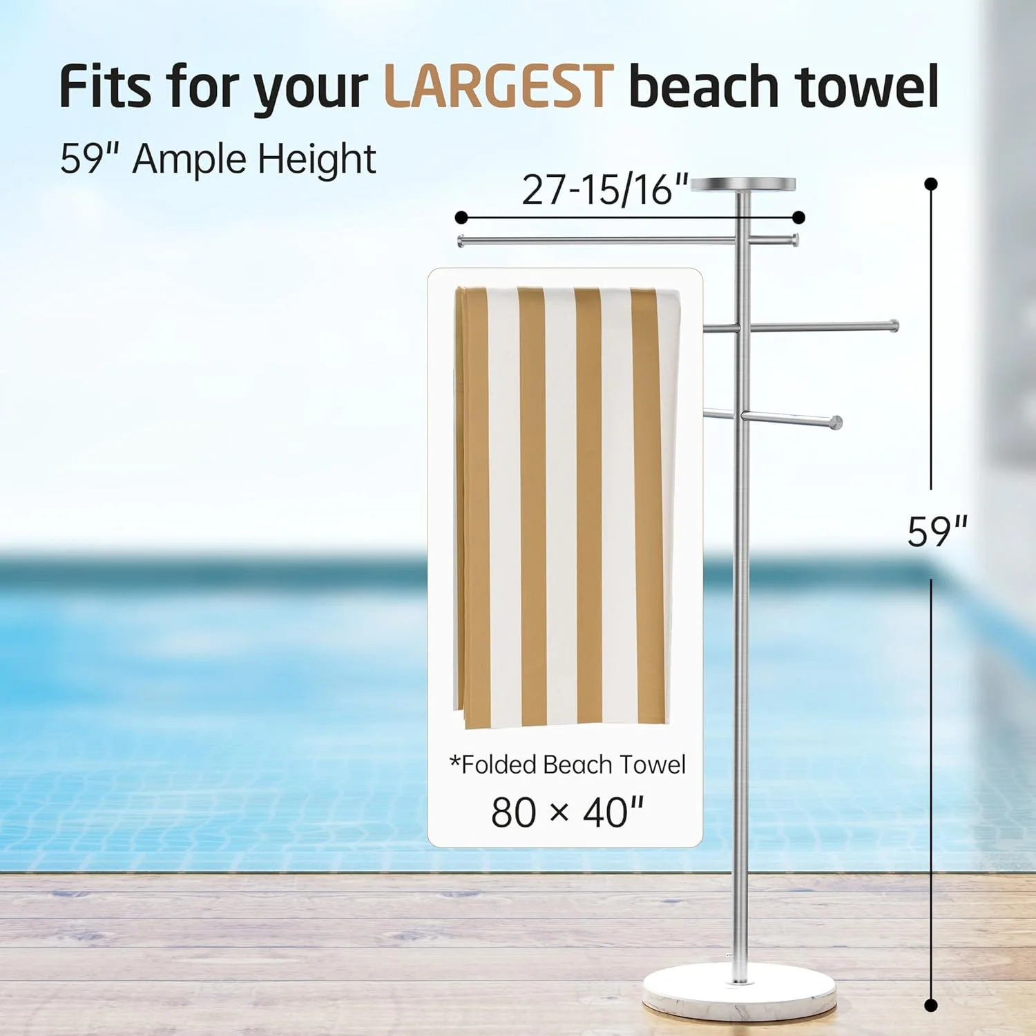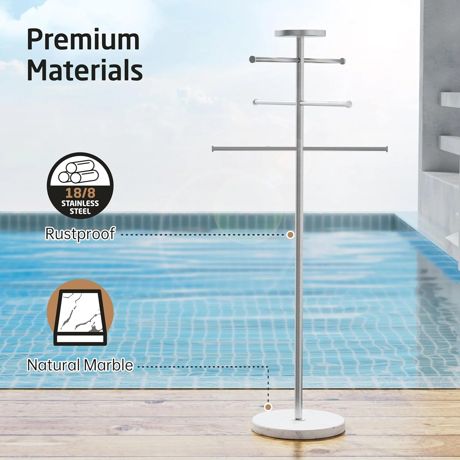 Improve your poolside or hot tub experience with the KES 5-Feet Outdoor Towel Rack, a trendy and sturdy add-on for your outside area. It has a up-to-date brushed look and a strong real marble base to resist the elements while adding style to your outdoor space.